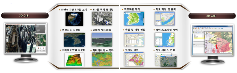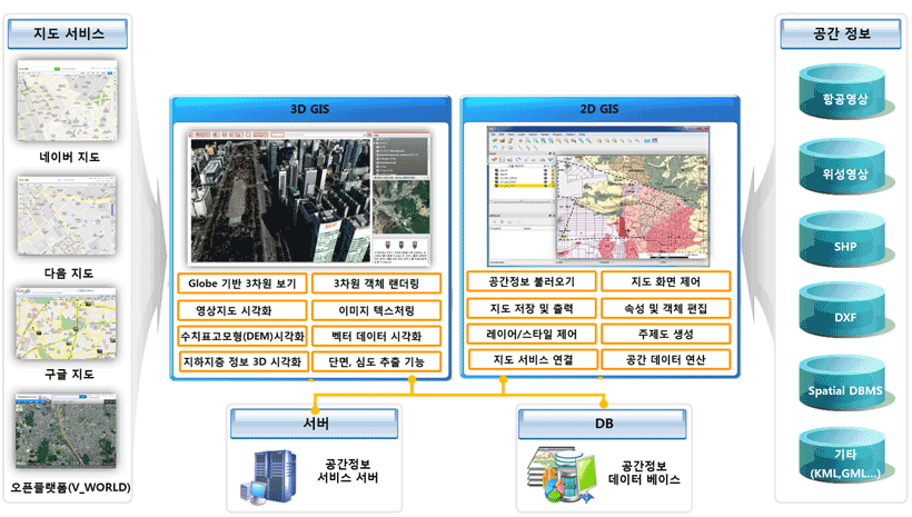 - 대용량 공간데이터(항공/위성 지도, SHP, DXF, GML, KML 등) 처리